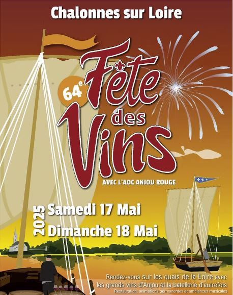 Les différentes fêtes des Vins de Chalonnes sur Loire Chalonnes sur Loire – 64ème Fête des Vins – Mai 2025 Chalonnes sur Loire – 63 ème Fêtes des Vins annulée – Mai 2024 62 ème Fête des Vins – Mai 2023 61 ème Fête des Vins – Mai 2022